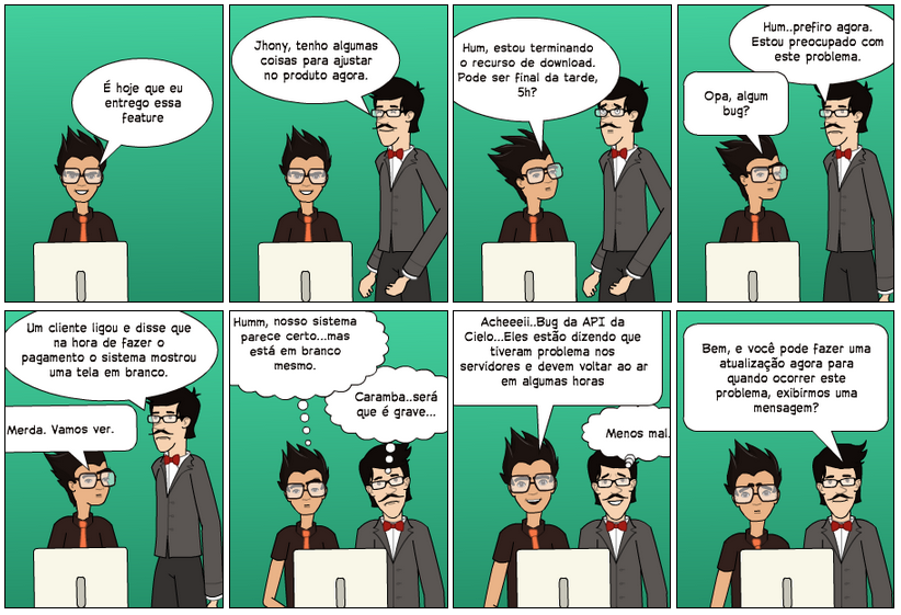 Este artigo é uma inspiração direta do livro Clean Coder de Robert Martin e das questões que o papel de Scrum Master me faz vivenciar. Agradeço também ao Fernando Jorge Mota, que revisou as primeiras tirinhas (criadas com muita facilidade pelo serviço http://www.pixton.com).